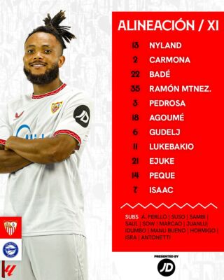 El once es el siguiente: Nyland, Carmona, Ramón Martínez, Badé, Pedrosa; Agoumé, Gudelj, Lukebakio, Ejuke; Peque e Isaac.